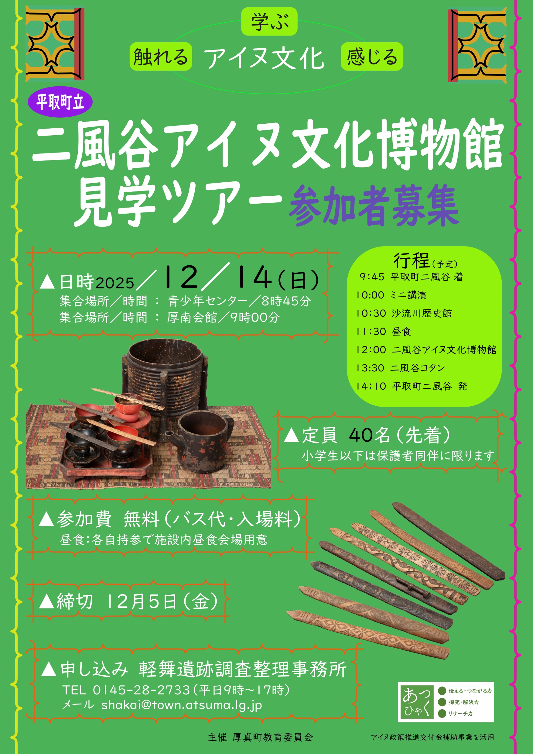 今回の見学ツアーでは、厚真のアイヌ文化をより理解するために周辺地域のアイヌ文化を「学ぶ」・「触れる」・「感じる」ことを目的としています。