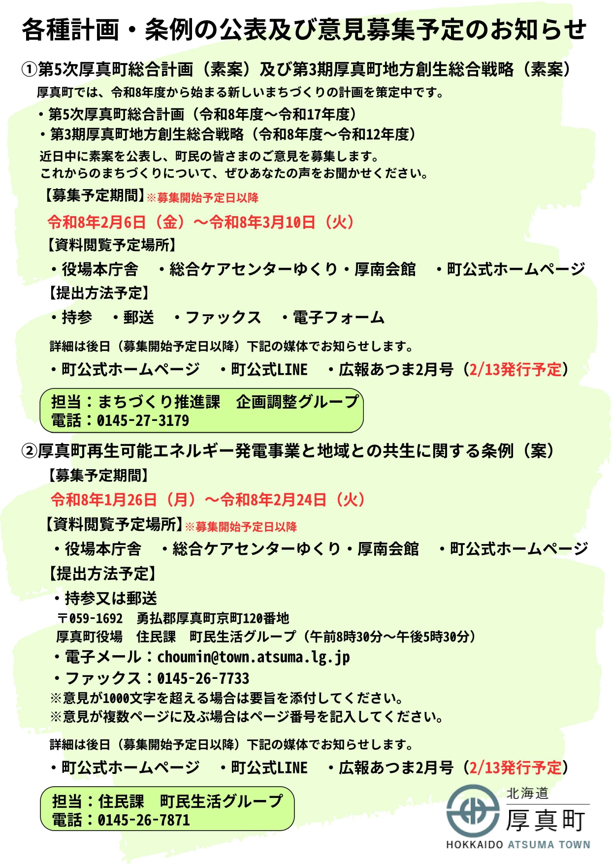 まちづくり推進課 企画調整グループ 電話:0145-27-3179 住民課 町民生活グループ 電話:0145-26-7871 |