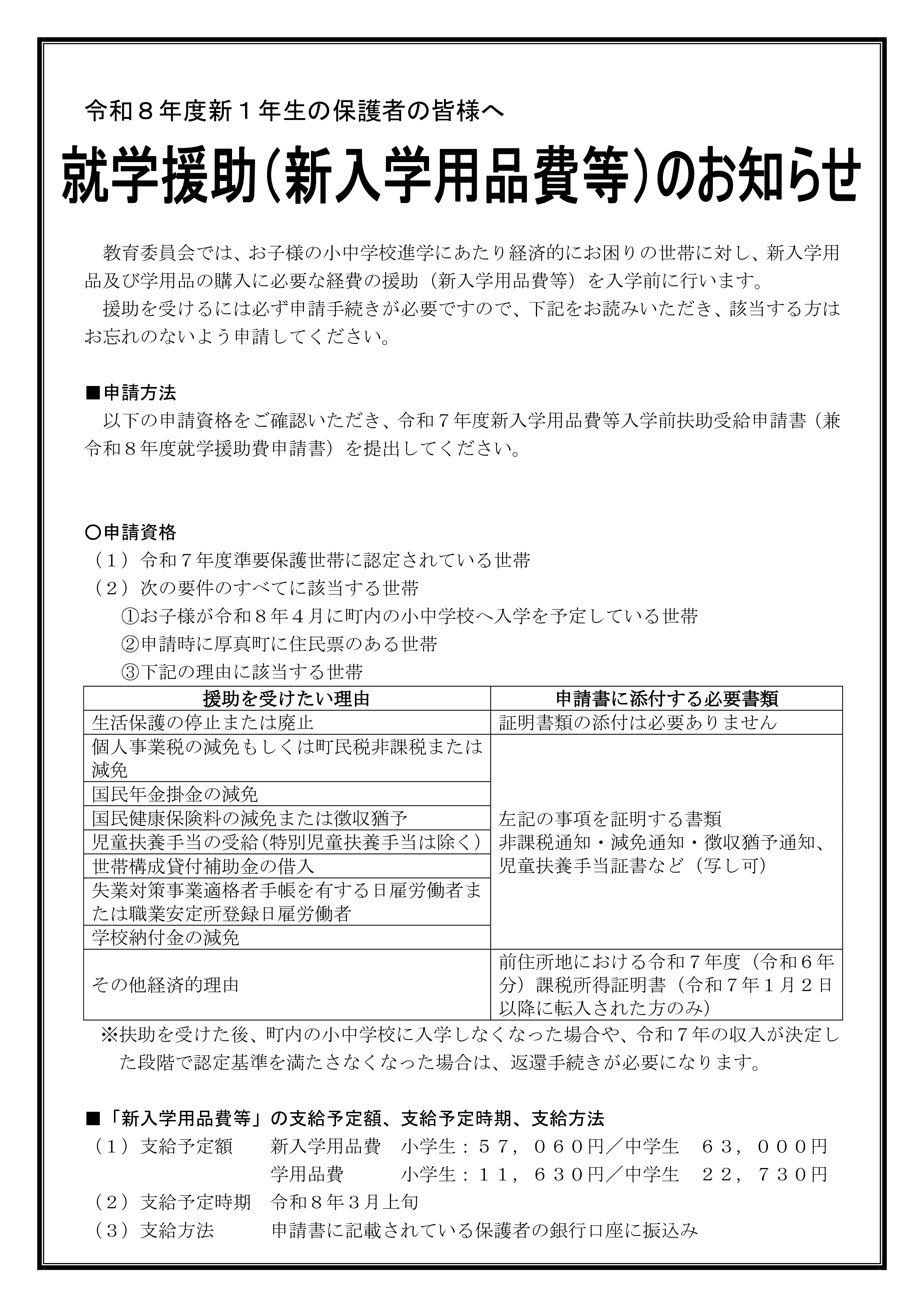 ※扶助を受けた後、町内の小中学校に入学しなくなった場合や、令和7年の収入が決定した段階で認定基準を満たさなくなった場合は、返還手続きが必要になります。