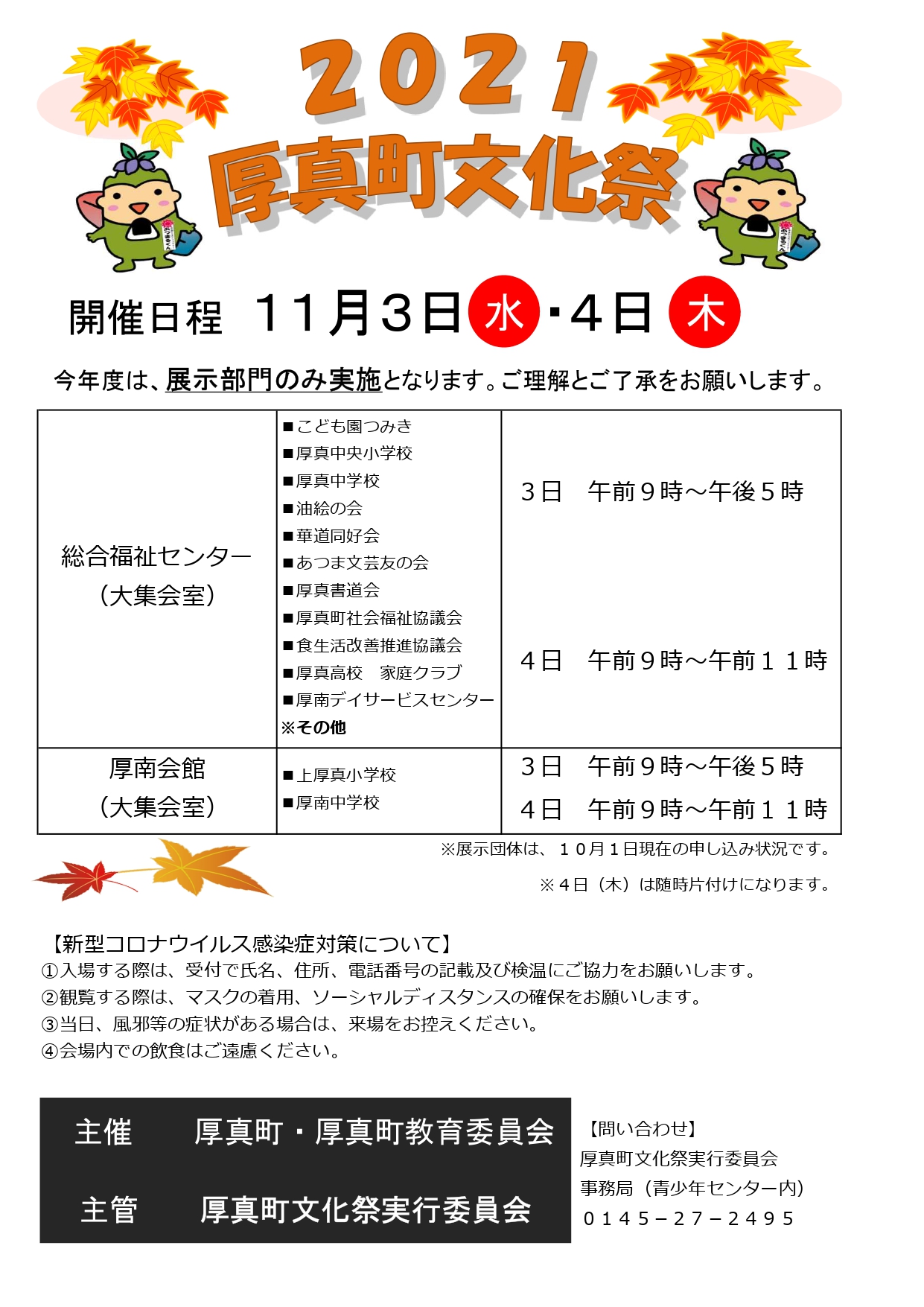 令和3年11月3日(水曜日)から4日(木曜日)にかけて、令和3年度厚真町文化祭を開催しました。 今年度は、新型コロナウイルスの影響を受けて、展示のみの開催となりましたが、総合福祉センター会場は265人、厚南会館会場は107人、合計372人の来場がありました。