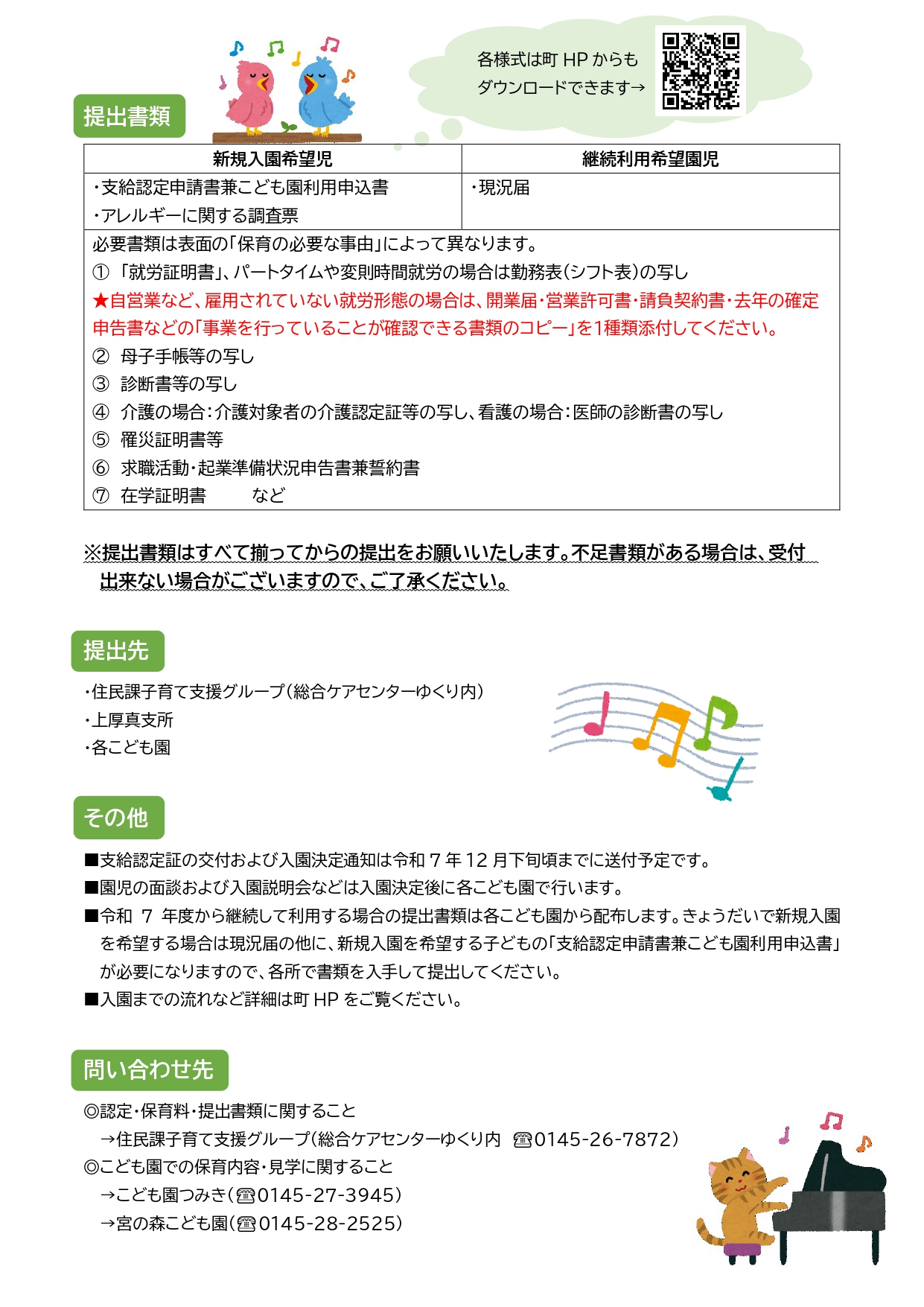 こども園の利用の申し込みは、次の書類を各こども園、住民課子育て支援グループまたは上厚真支所までご提出ください。