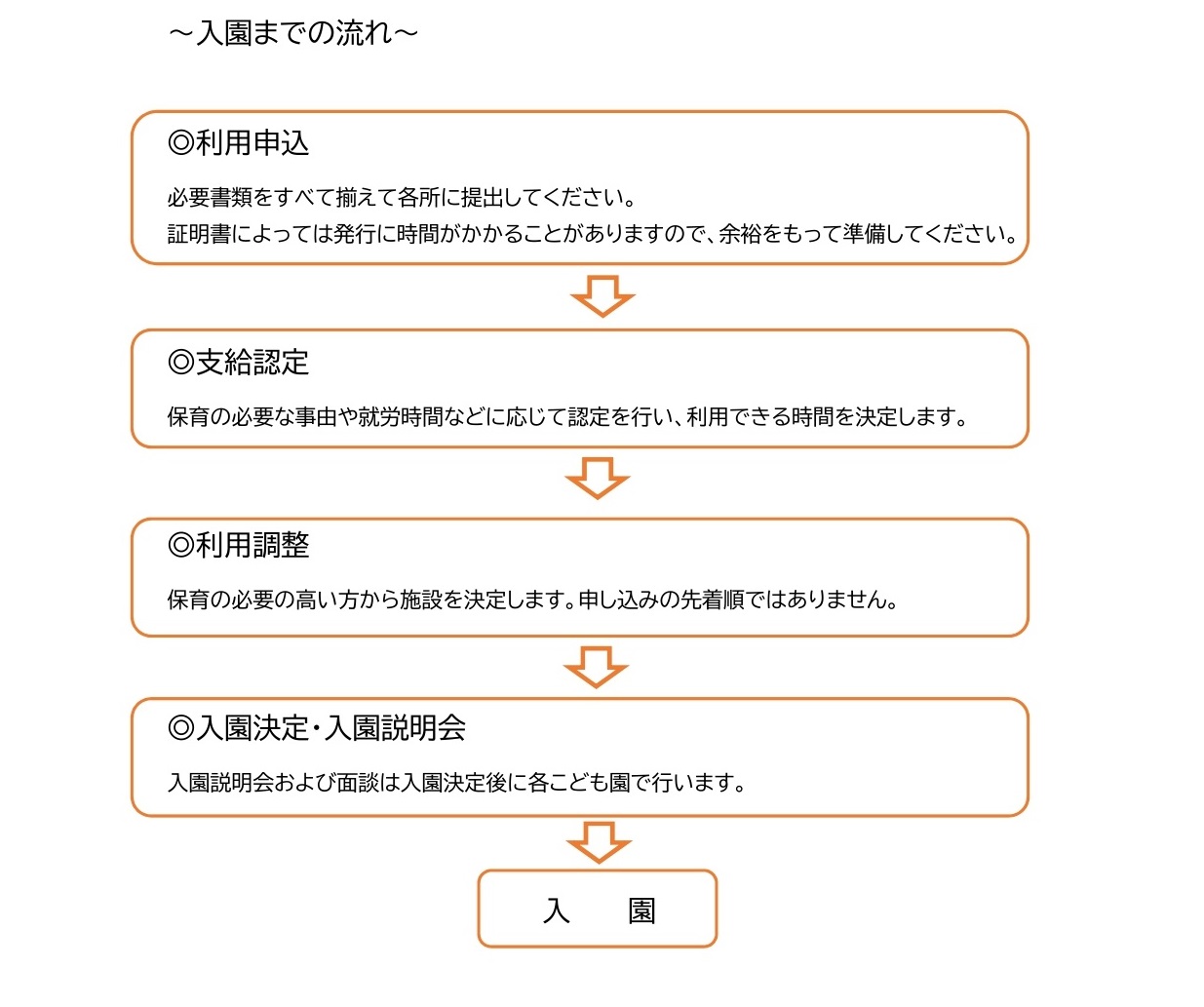 | 必要書類は表面の「保育の必要な事由」によって異なります。 (1)「就労証明書」、パートタイムや変則時間就労の場合は勤務表の写しも必要です。 ★自営業など、雇用されていない就労形態の場合、開業届・営業許可書・請負契約書・去年の確定申告などの「事業を行っているこどが確認できる書類のコピー」を1種類添付してください。 【就労証明書 PDF形式】【就労証明書 Excel形式】【プルダウンリスト】 【就労証明書の記入について】 (2)母子手帳等の写し (3)診断書等の写し (4)介護の場合:介護対象者の介護認定証の写し 看護の場合:医師の診断書の写し (5)り災証明書等 (6)求職活動・起業準備状況申告書兼誓約書【PDF形式】 (7)在学証明書 など |