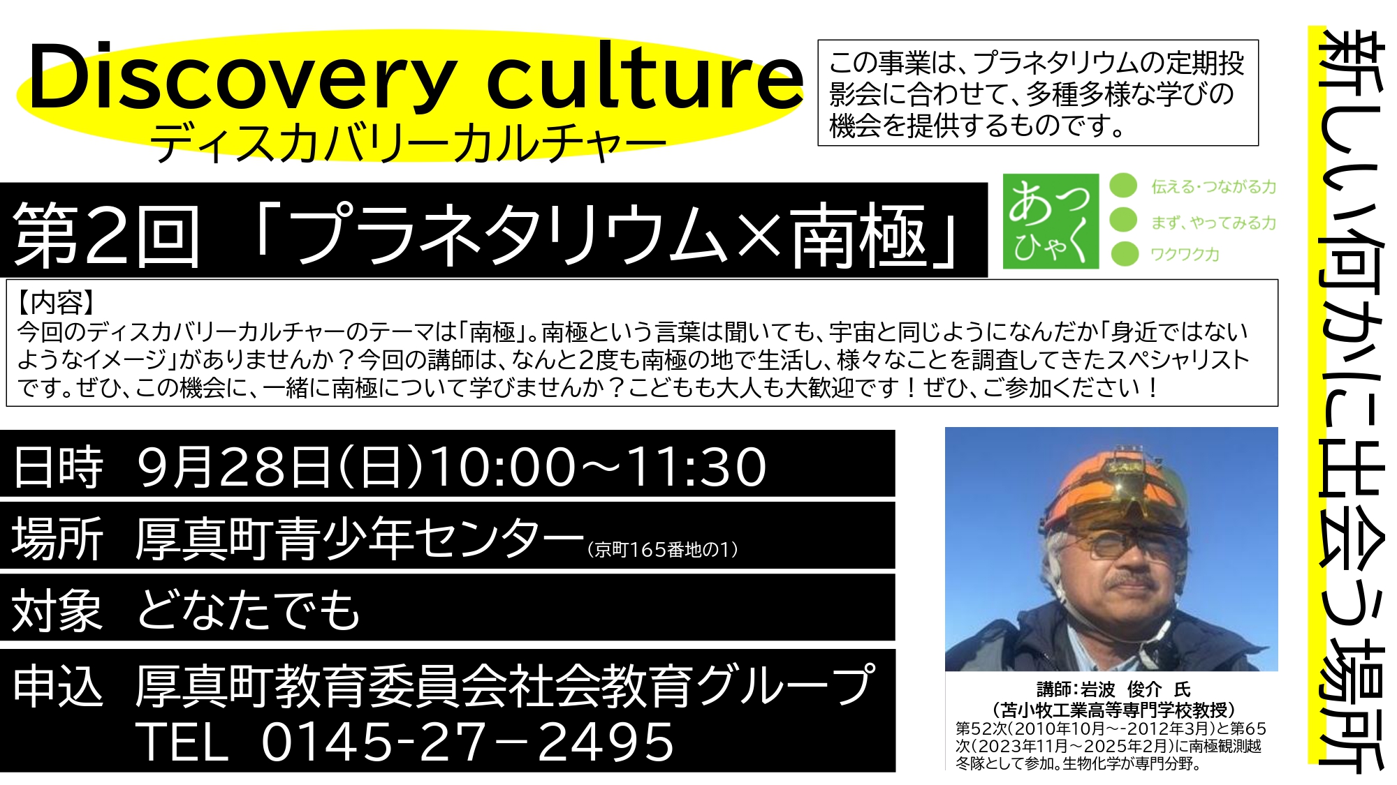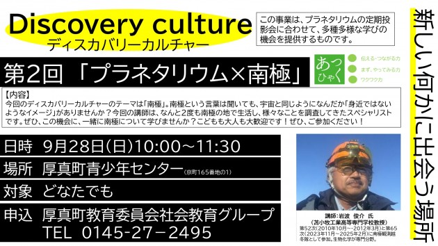 令和7年度2回目のディスカバリーカルチャーのテーマは南極。町内外から20人の参加があり、知られざる南極の世界について、楽しみながら理解を深める時間となりました。