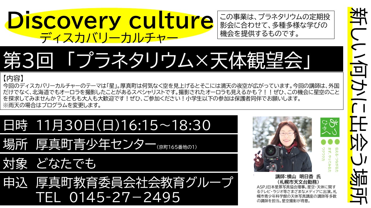 令和7年度3回目のディスカバリーカルチャーのテーマは天体観望会。町内外から夜空の星やプラネタリウム、オーロラの写真を楽しみにしていきた方々が町内外から15人程度の参加があり、夜空の星を楽しみながら厚真町のすばらしさを感じる時間となりました。