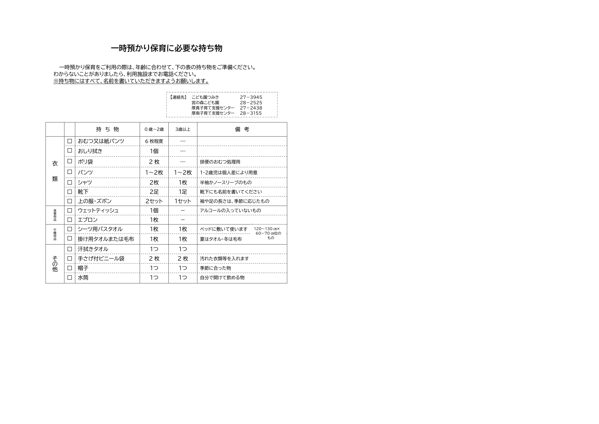 一時預かり保育をご利用の際は、年齢に合わせて下記表の持ち物をご準備ください。わからないことがありましたら、利用施設までお電話ください。