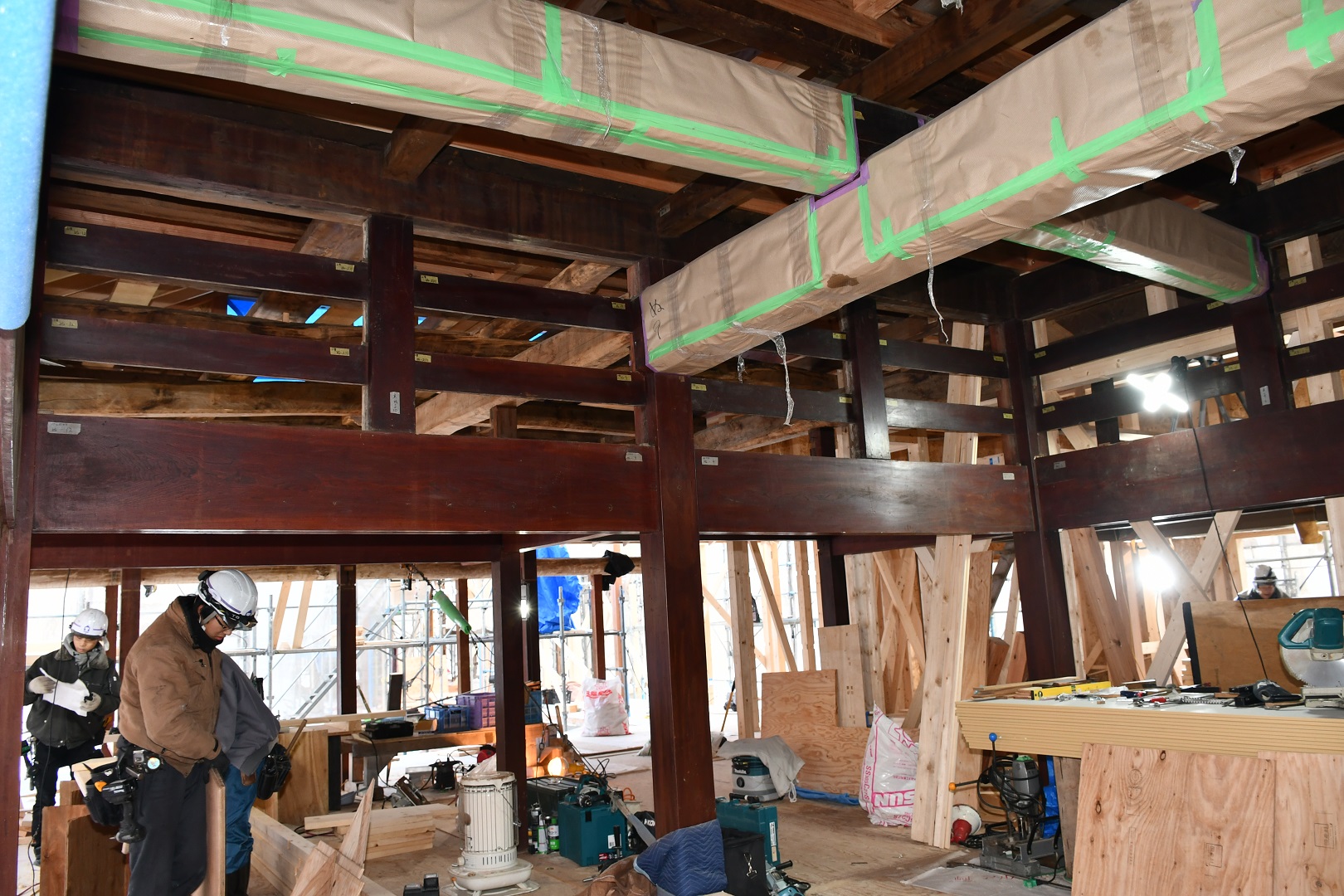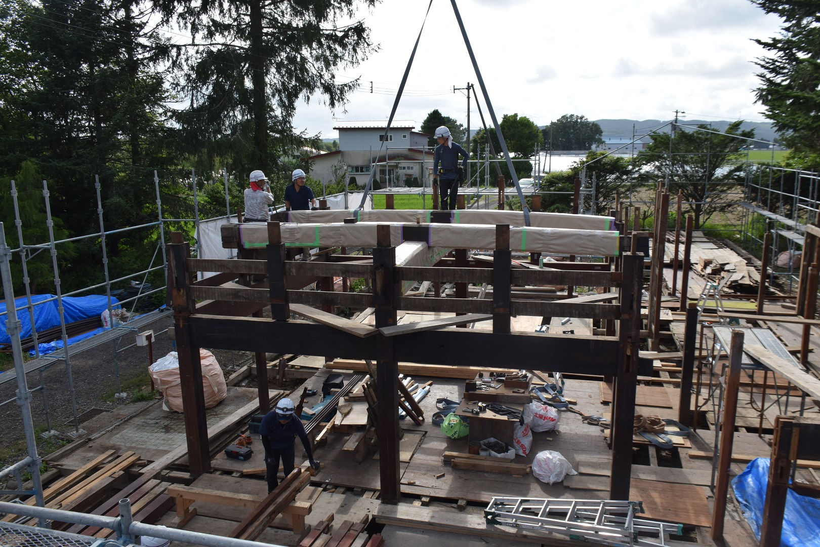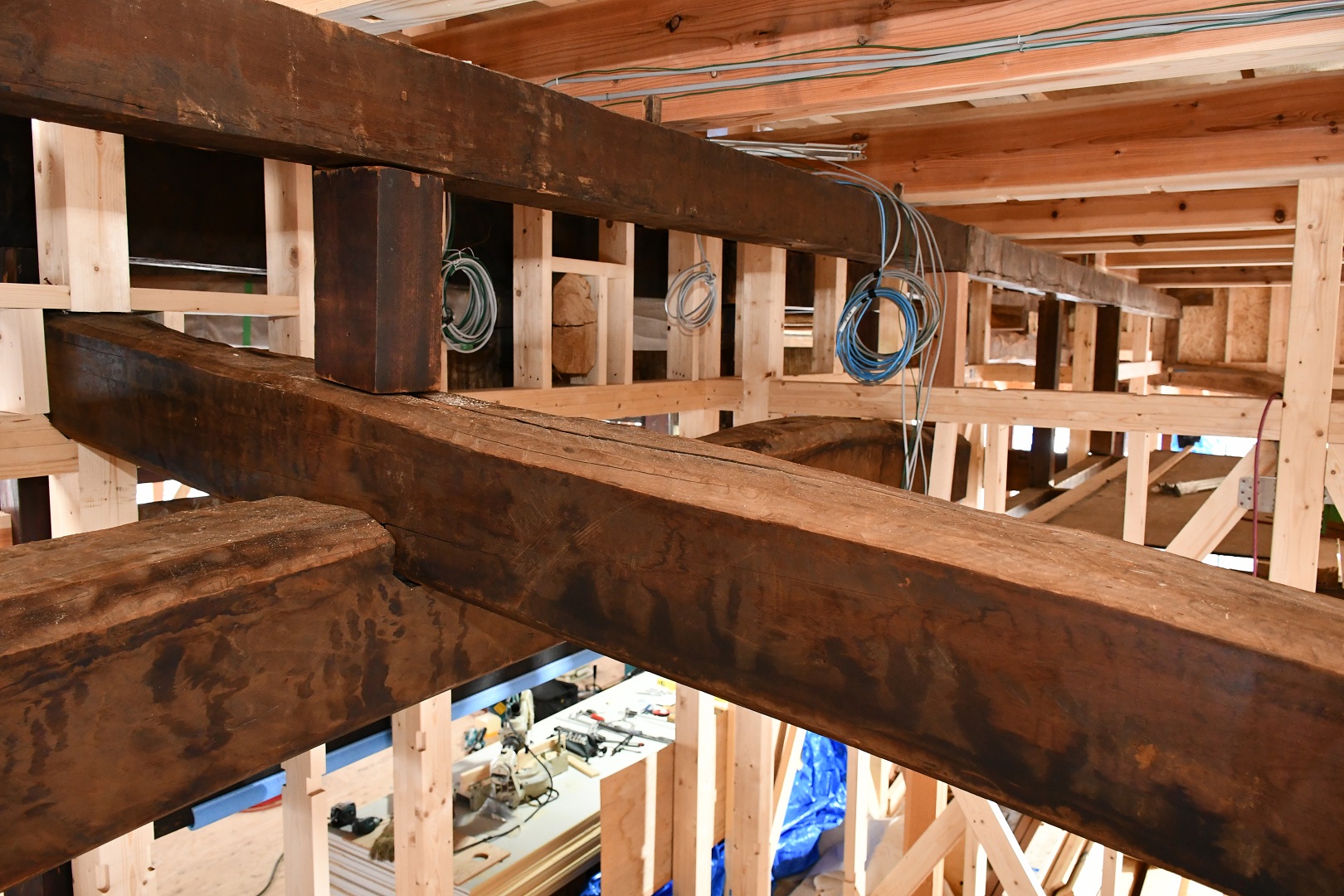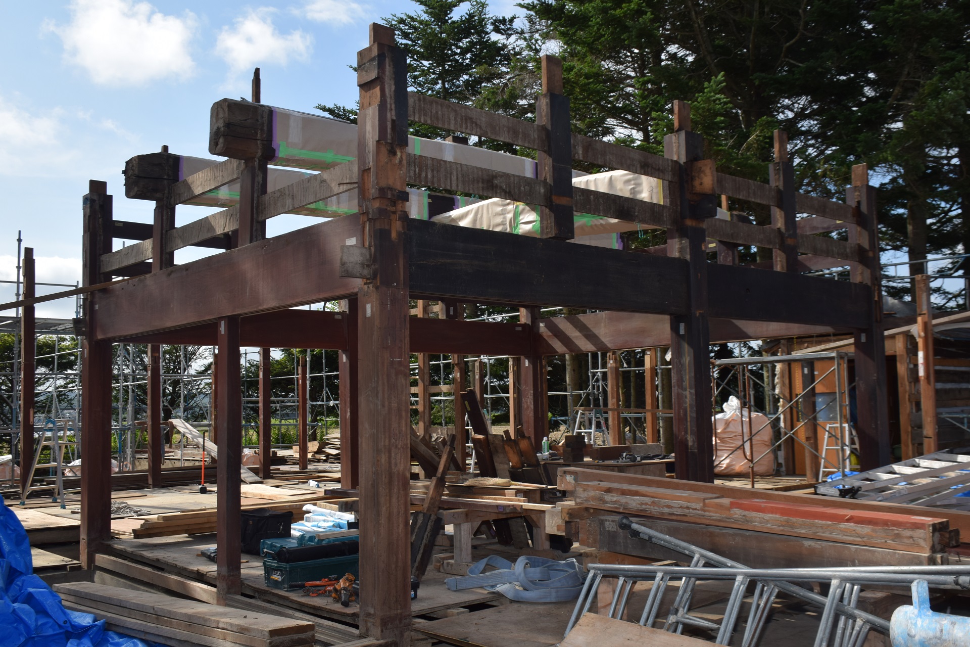 令和4年10月から豊沢地区環境保全林内で始まった旧幅田邸の移築工事は、特徴である越中造(富山県)民家伝統工法「枠の内」の架構までが組みあがりました。古民家で用いられている頑健な部材と、それを補う真新しい部材の両方を見ることができる貴重な場面です。