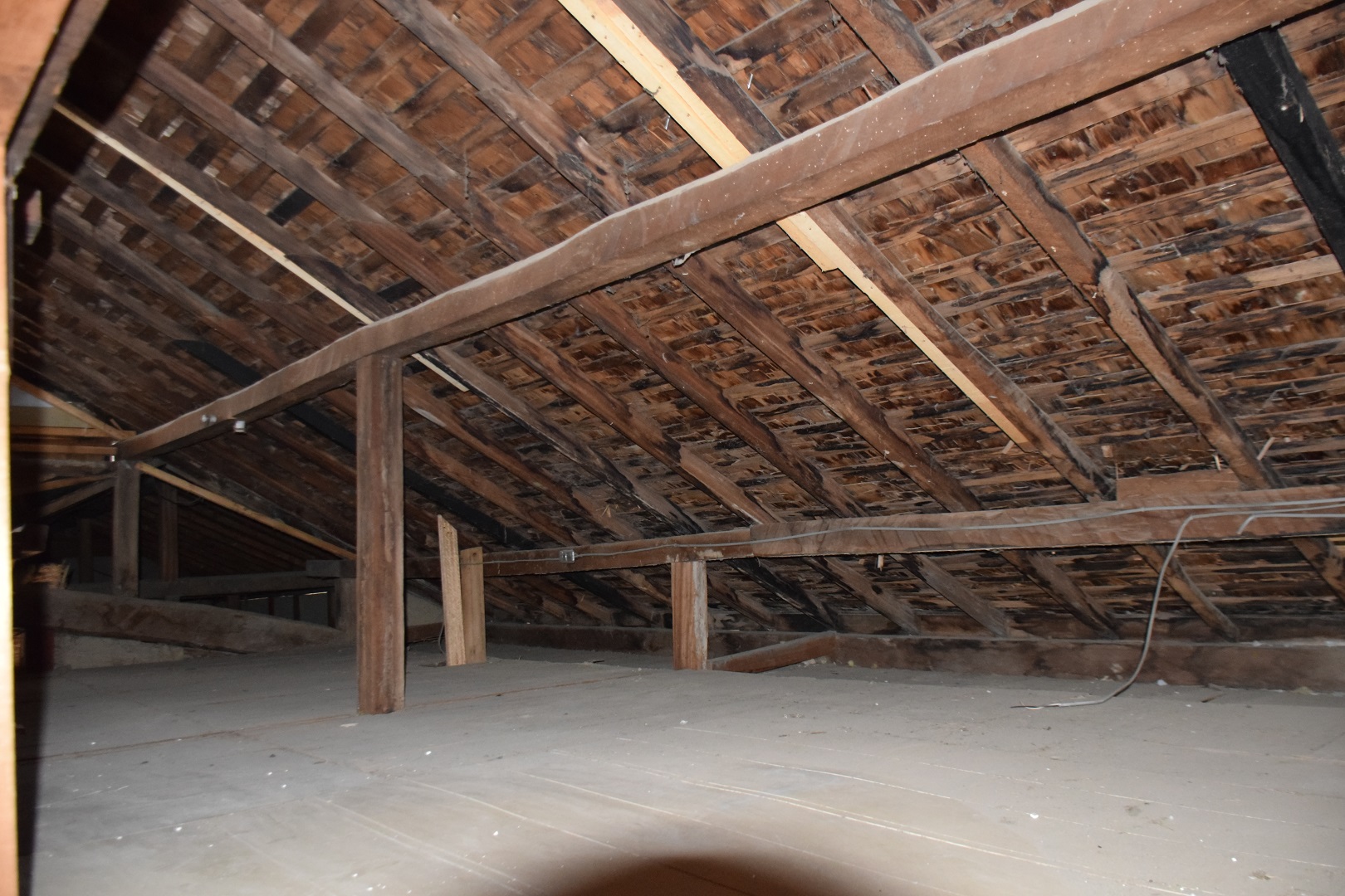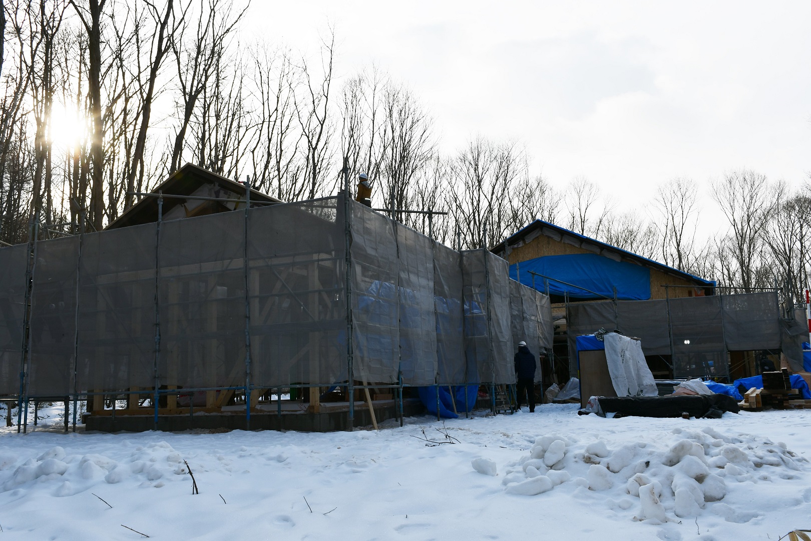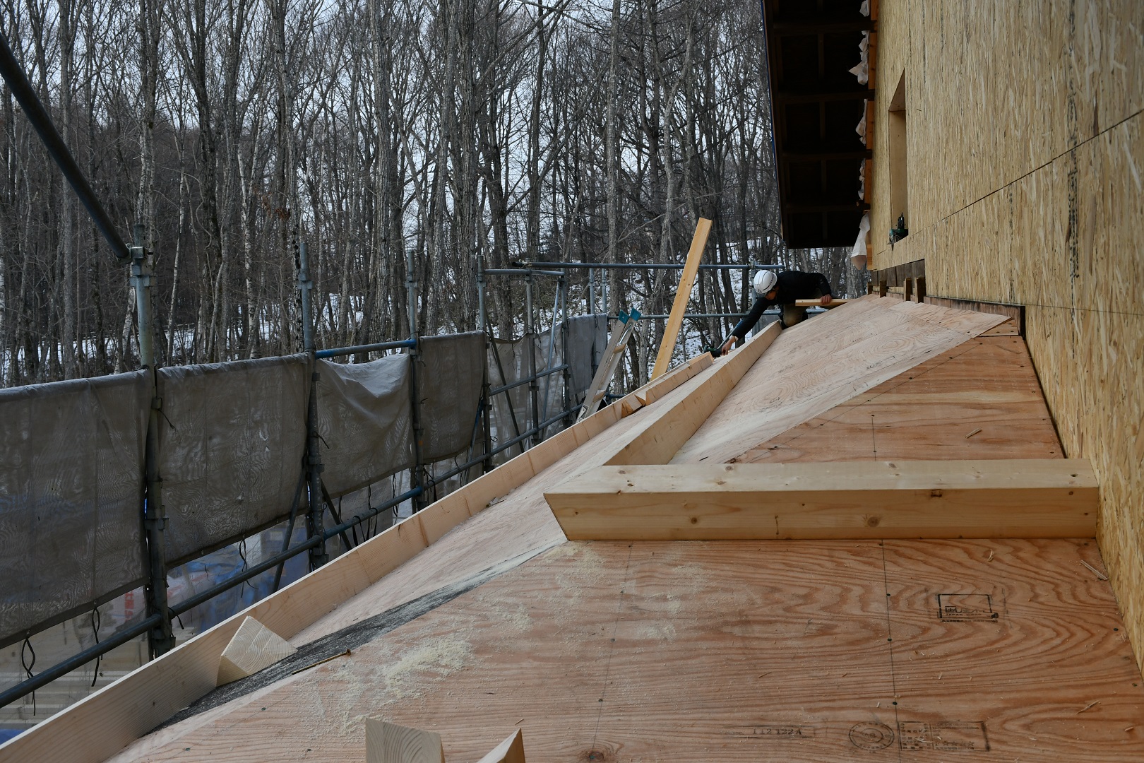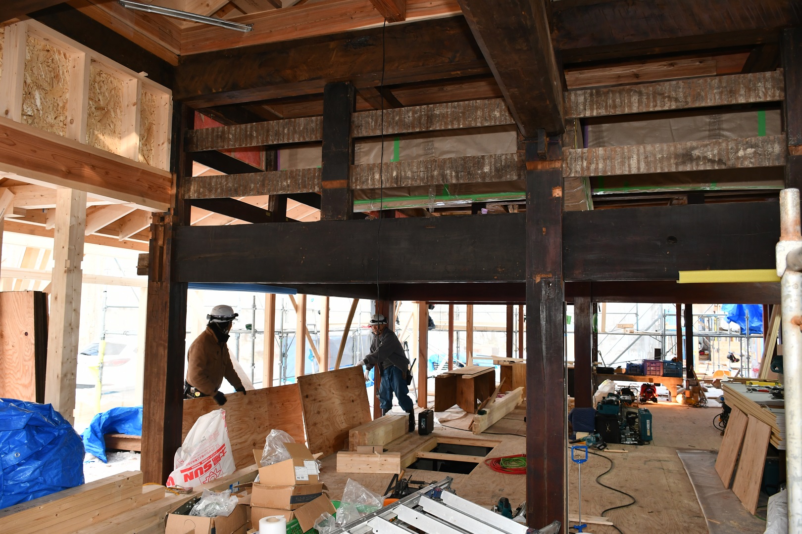 令和4年10月から豊沢地区環境保全林内で始まった旧幅田邸の移築工事は、特徴である越中造(富山県)民家伝統工法「枠の内」の架構までが組みあがりました。古民家で用いられている頑健な部材と、それを補う真新しい部材の両方を見ることができる貴重な場面です。