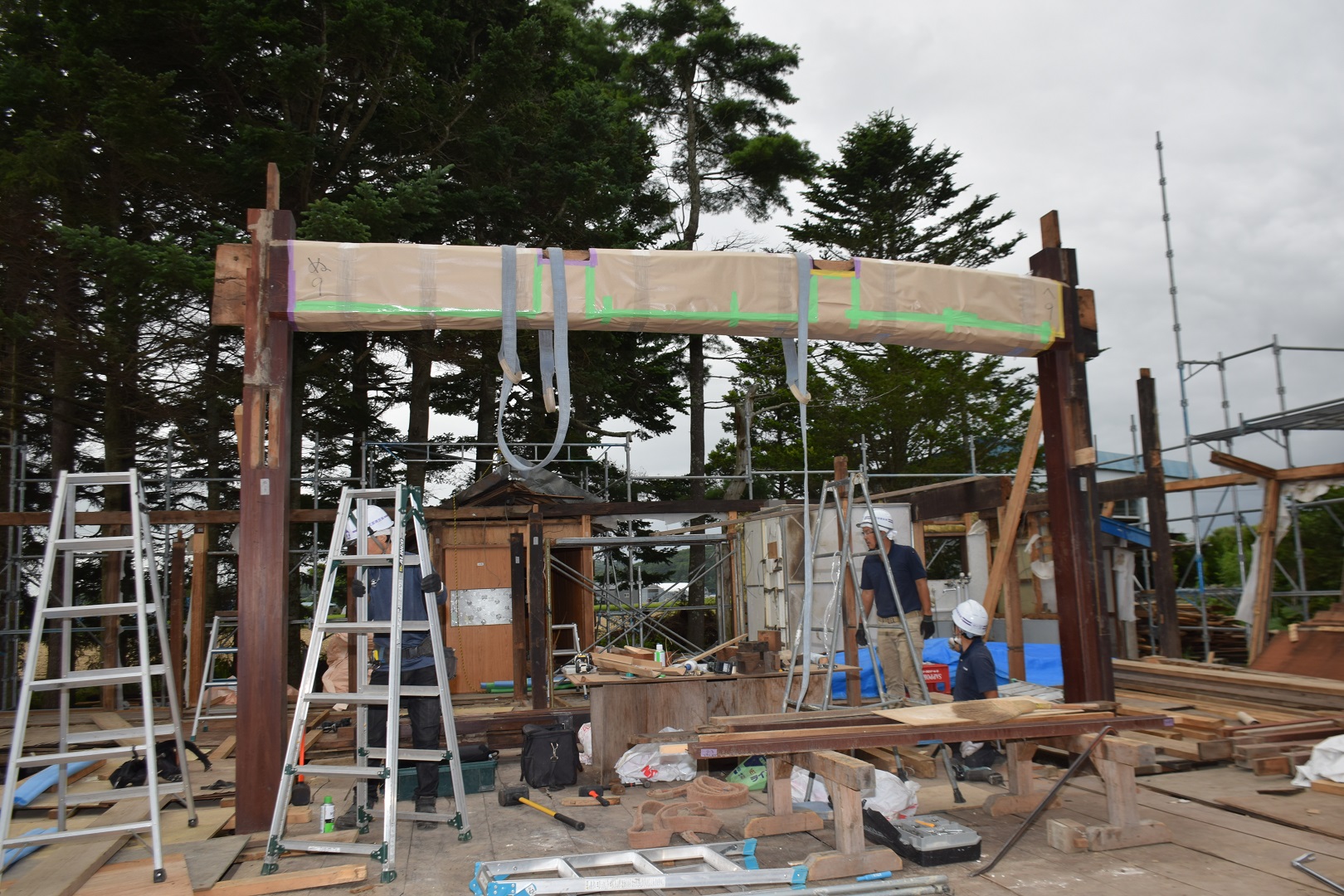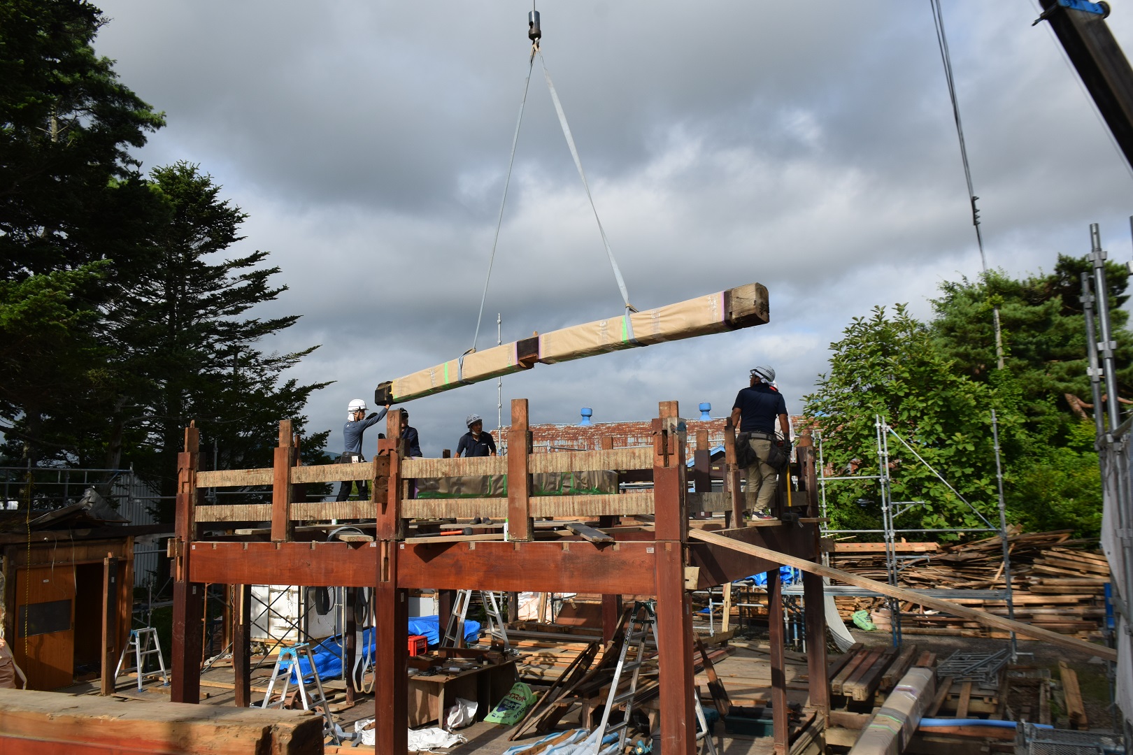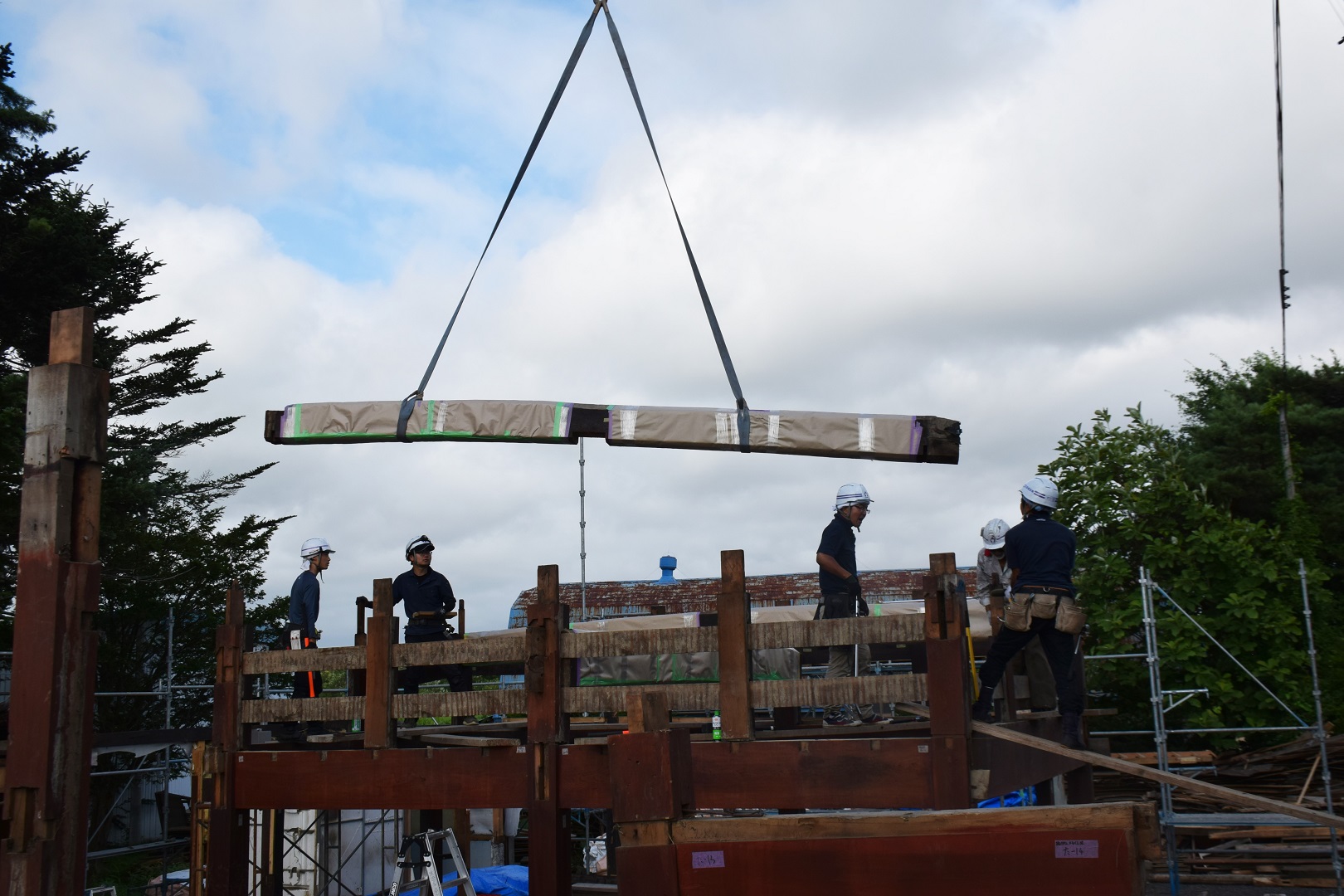 解体作業は、ほとんどが大工の皆さんの手作業で、慎重に進められました。このあと、構造体の強度試験を行い、9月から豊沢地区環境保全林内で移築工事が始まる予定です。