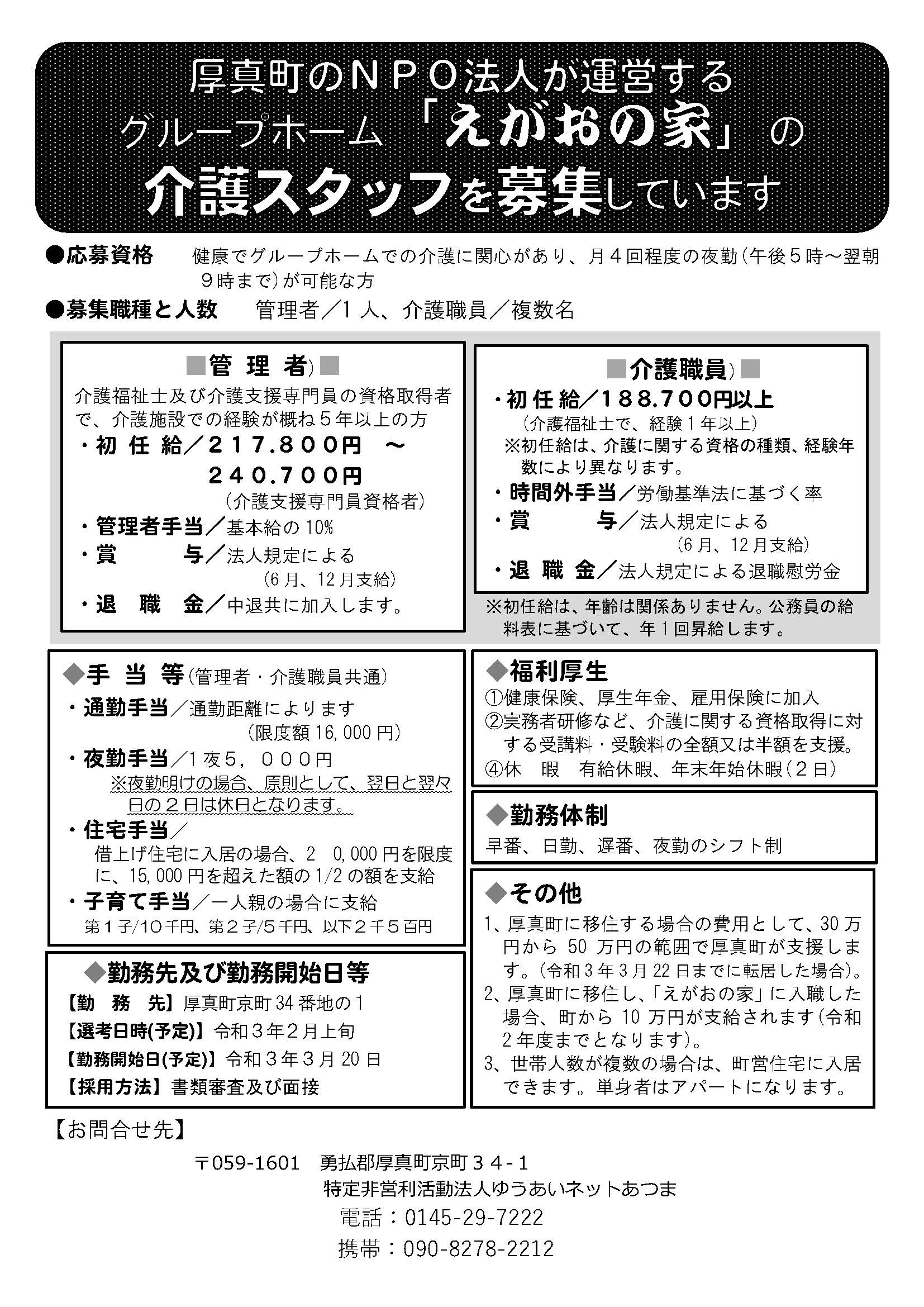 厚真町内の介護施設・介護サービス事業所に新たに雇用され、厚真町に移住される方、町外から厚真町に通勤される方に対して、5年勤務することを条件として、事業所が新規雇用者(正職員または雇用保険適用者)に就労支援金を支給した場合に町が事業所に補助します。