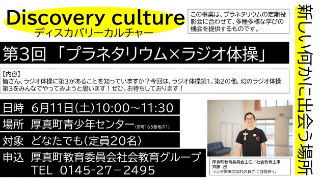 令和4年6月11日(土曜日)に開催したディスカバリーカルチャー第3回「プラネタリウム×ラジオ体操」には、17人のご参加をいただきました。