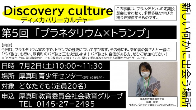 令和4年7月2日(土曜日)に開催したディスカバリーカルチャー第5回「プラネタリウム×トランプ」には、10人のご参加をいただきました。トランプの知られざる歴史を学んだあと「厚真町ババ抜き王決定戦」を行い、白熱した戦いが繰り広げられました。