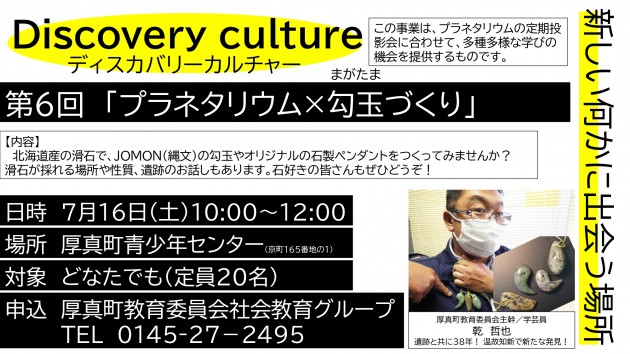 令和4年7月16日(土曜日)に開催したディスカバリーカルチャー第6回「プラネタリウム×勾玉づくり」には、8人のご参加をいただきました。縄文時代のアクセサリーをみんなで一生懸命作りました。