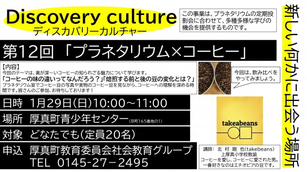 令和5年1月29日(日曜日)に開催したディスカバリーカルチャー第12回「プラネタリウム×コーヒー」には、25人のご参加をいただきました。今回は、コーヒーとはいったい何なのか。コーヒー豆の焙煎や、コーヒーのおいしい入れ方などを学び、参加者全員でコーヒーの飲み比べ体験等も実施しました。